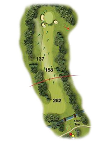 Keep your tee shot left of center as the trees on the right will block your next shot on this dog-leg right. Look closely for the elevated marker behind the green for your target. 3 greenside bunkers, 1 on the right and 2 on the left.